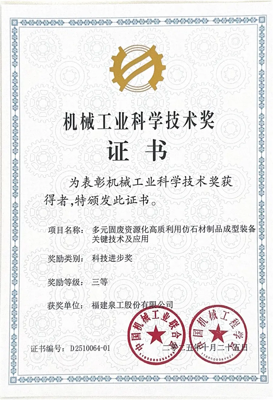 Nylig ble listen over vinnere for 2025 China Machinery Industry Science and Technology Award offisielt kunngjort. Prosjektet "Key Technologies and Applications of Forming Equipment for High Value Utilization of Diversified Solid Waste Resources into Simulated Stone Products," ledet av Fujian Quangong Machinery Co., Ltd., vant tredjeprisen for teknologisk fremgang. Denne prisen demonstrerer fullt ut den høye anerkjennelsen avQuangong Machinery Co., Ltd.'s teknologiske innovasjonsevner og tekniske applikasjonsprestasjoner innen høyverdi utnyttelse av fast avfallsressurser og intelligent formingsutstyr for simulerte steinprodukter.